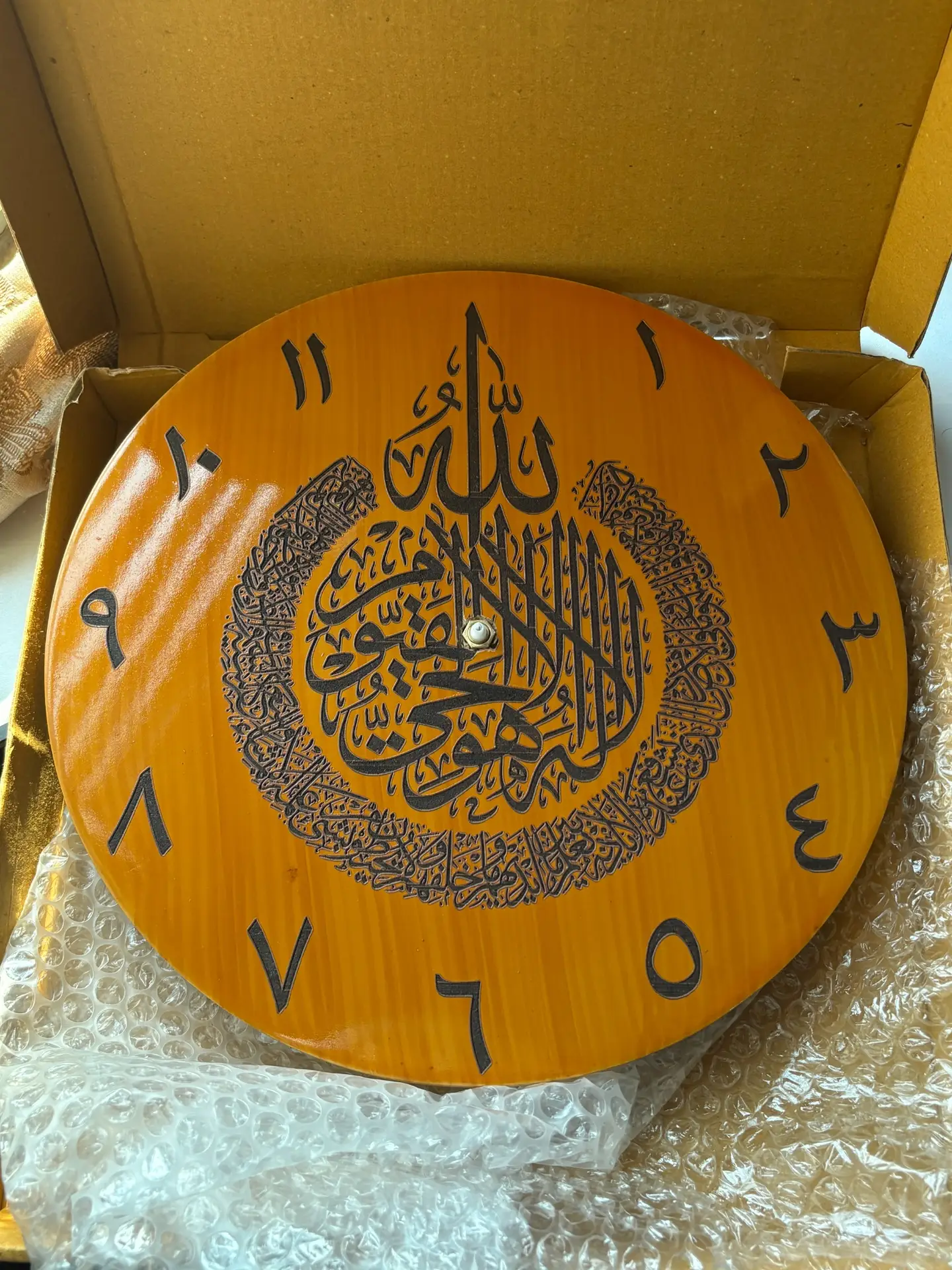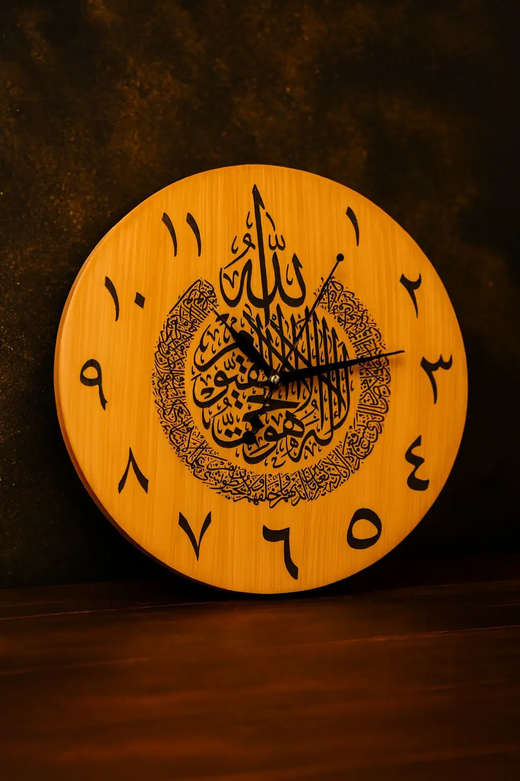 Bring elegance and spiritual beauty into your space with this Premium 12-inch Islamic Calligraphy Wall Clock. Designed with a rich wooden finish, the clock showcases stunning Arabic calligraphy at the center, adding a touch of sophistication and Islamic aesthetics to any room. Crafted with care, this wall clock offers: 12-inch round size — ideal for living rooms, bedrooms, offices, or prayer corners Premium wooden look — warm and classy Beautiful Arabic calligraphy — enhances spiritual ambiance Clear numeral design — easy time reading Lightweight & durable — perfect for long-term use This clock is not just a timepiece—it’s a decorative masterpiece that brings style, meaning, and elegance to your home.